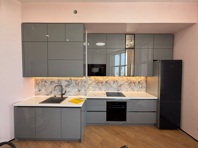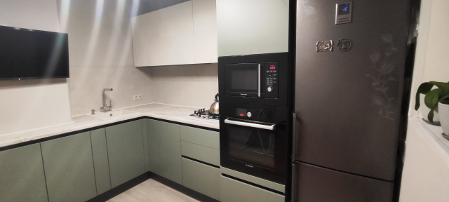 Г-образная кухня с бархатистыми фасадами