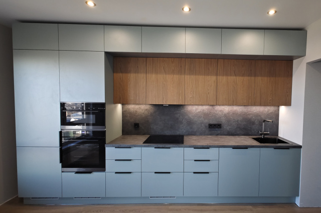 Назначили день приезда замерщика. Приехал вовремя. С менеджером уточнили все размеры по проекту, внесли правки. Выбрали в салоне кран, встраиваемую технику Крона: вытяжку, варочную панель и двухъярусный (!) духовой шкаф. Техника обошлась нам дешевле, чем такая же в интернете! Светлана применила максимум скидок и бонусов, и мы приступили к оформлению договора. Бумаг очень много: на каждый нестандартный шкафчик, отдельная бумажка. Но я считаю это плюсом — меньше вероятность недопонимания. Внесли предоплату — 30%. На утверждение в техническом отделе ушло две недели. Несколько раз звонила очень приятная женщина- технолог (к сожалению, не помню её имени), уточняла цвет элементов, согласовывала замены механизмов у нестандартных выдвижных ящиков в связи с техническими нюансами. После утверждения прислали СМС, чтобы мы оплатили в салоне оставшуюся часть. На изготовление ушло ещё две недели. С ремонтом помещения мы не успели. Поэтому воспользовались возможностью бесплатного хранения готовой кухни на складе фирмы ещё две недели. Из отдела логистики позвонили и спросили, когда удобно будет доставить нашу кухню. Назначили день и время. Привезли вовремя. Разгрузили, подняли на этаж, занесли, аккуратно поставили, сфотографировали два молодых крепких сотрудника. Попросили до приезда сборщиков ничего не трогать. В назначенный день, даже чуть раньше оговоренного времени, приехали два сборщика. Собирали и устанавливали кухню два дня (по проекту мебели много, задействовано три стены). Без сюрпризов, конечно, не обошлось. Несмотря на то, что мебель была оооочень хорошо упакована, у одного из настенных шкафов на задней стенке сборщики выявили большую трещину, и он был установлен в таком виде. Сборщики сами составили рекламацию, и через месяц нам привезли и установили новый шкафчик.