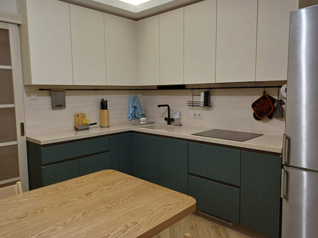 Г-образная кухня с бархатистыми фасадами