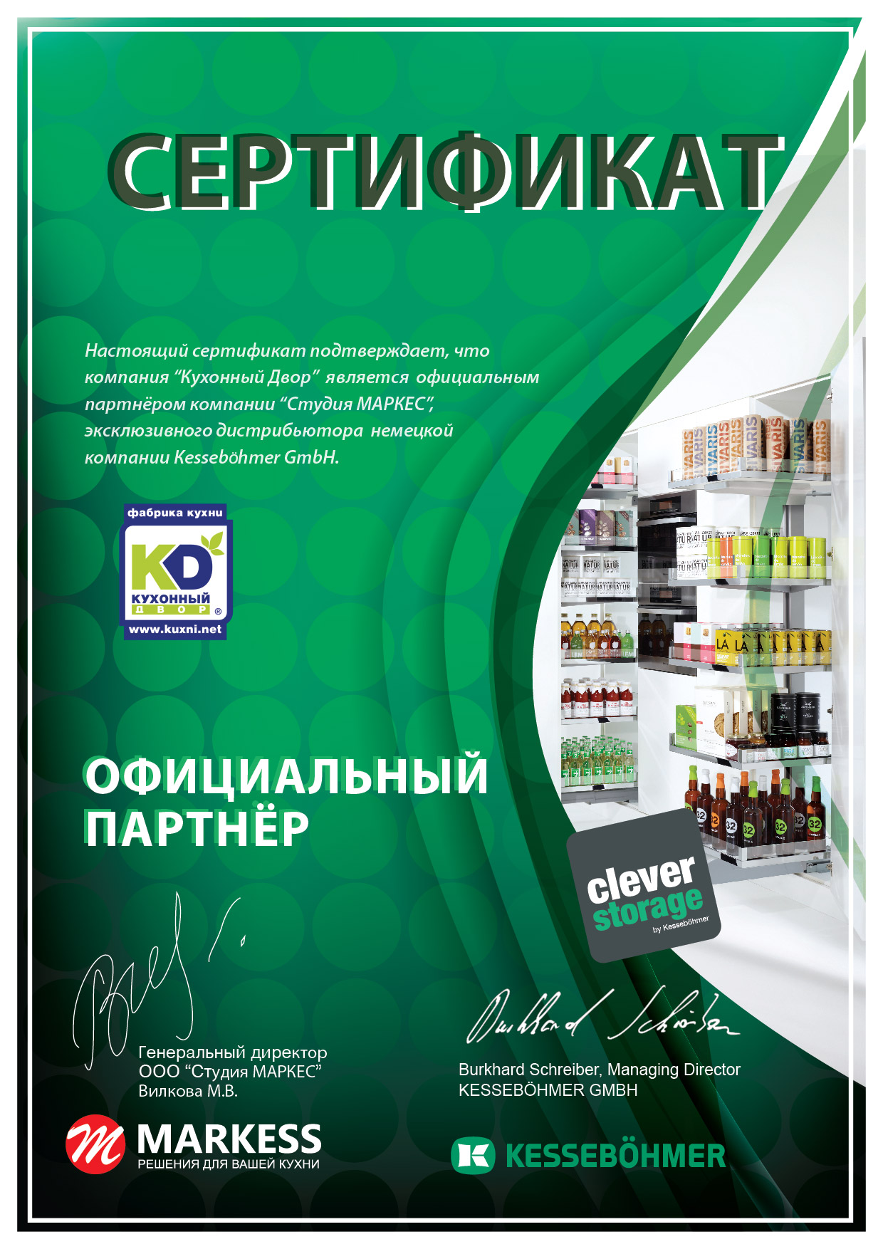 Заботясь о себе и близких, мы изучаем этикетки на продуктах питания. У кухонь этикеток с подробной информацией о составе нет. Тогда как убедиться в их качестве? Ответ на этой странице! Кухни от «KD» создаются из материалов с международным классом безопасности «Е1». Они безвредны даже для самых маленьких, и это подтверждено действующими сертификатами. Фурнитура? Встраиваемая техника? Вы можете быть уверены в них не меньше, чем в материалах! «Кухонный Двор» сотрудничает с проверенными партнерами. Убедитесь в этом сами!