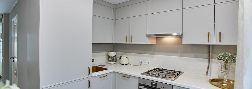 «Джейн» выполнена под потолок и, подобно свадебному венцу, «коронована» лаконичными карнизами. Её фасады мягкого светло-серого цвета имеют утончённую фрезеровку и оснащены уникальным покрытием «Regen Skin». Это покрытие способно восстанавливаться после царапин, так что мелкие бытовые неприятности красавице-«Джейн» не страшны!