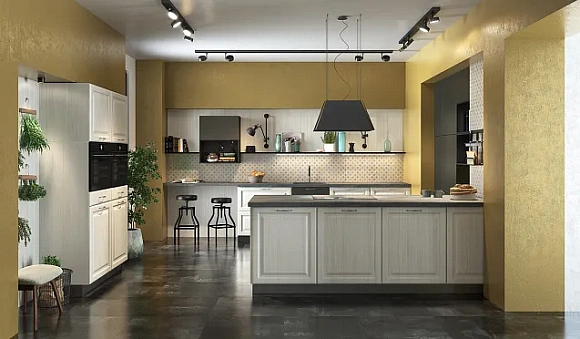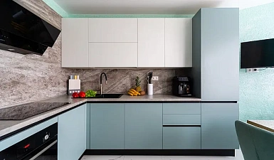Кухня на заказ с открытыми верхними полками – подходящее решение для небольших помещений. Подобные модели позволяют сохранить воздушность и свет, не перегружают помещение. При этом на полках удобно хранить высокие емкости, стопки тарелок и банки со специями.