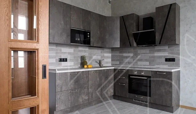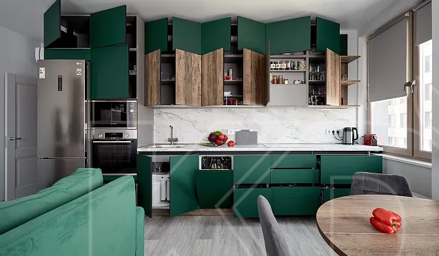 Кухня на заказ с открытыми верхними полками – подходящее решение для небольших помещений. Подобные модели позволяют сохранить воздушность и свет, не перегружают помещение. При этом на полках удобно хранить высокие емкости, стопки тарелок и банки со специями.