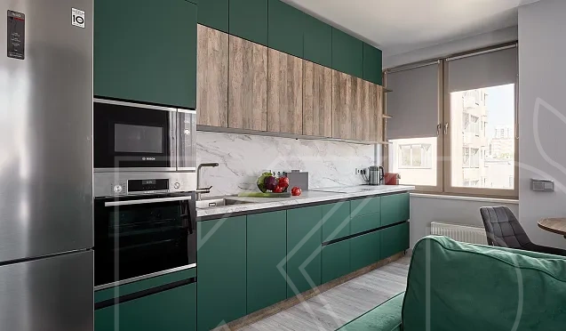 Бытовую технику лучше спрятать за фасадами встроенных шкафов. Благодаря этому приему кухонное помещение визуально будет выглядеть более просторным и свободным.