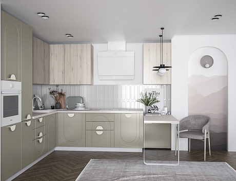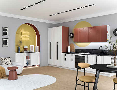 - Арочная фрезеровка фасадов кухни Арко Атриум — не просто декор, а стилистический код, в котором зашифрованы вечная красота и гармония. Её изгибы создают рельеф, в котором играет свет, а тени оживляют поверхность, превращая ее в часть живого пространства. Контрастный терракотовый верх фасадов словно напоминает о закатах над морем, а спокойный матовый низ оттеняет его, создавая баланс и глубину. Кухня становится не только зоной для приготовления еды, но и настоящей архитектурной доминантой интерьера.
