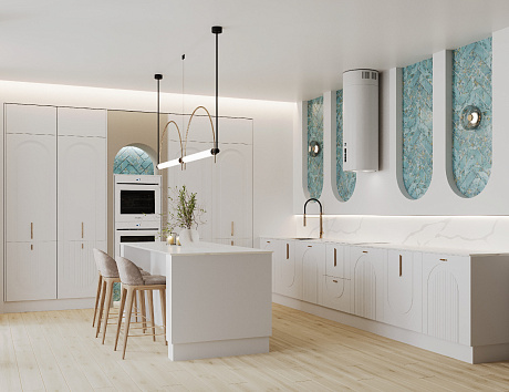 Ведущая доминанта кухни — рабочая зона с исключительно нижними модулями. Арочная фрезеровка на фасадах, направленная и вверх и вниз, придает пространству динамику. Мраморный рисунок на столешнице и фартуке отсылает к древнегреческим храмам, над ним — уложенная елочкой бирюзовая плитка. Элемент фартука? Больше. Это полноценный арт-объект.