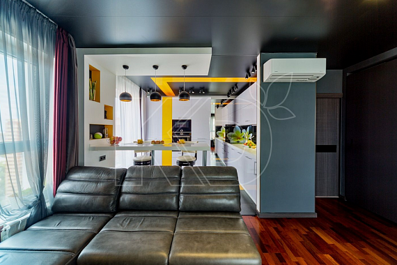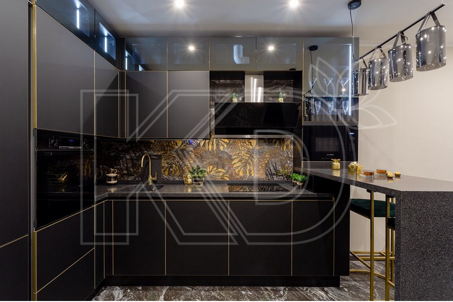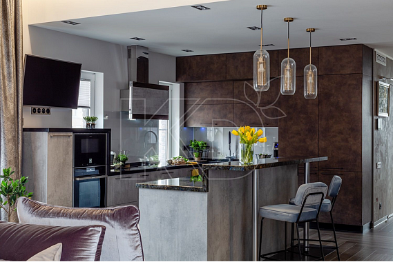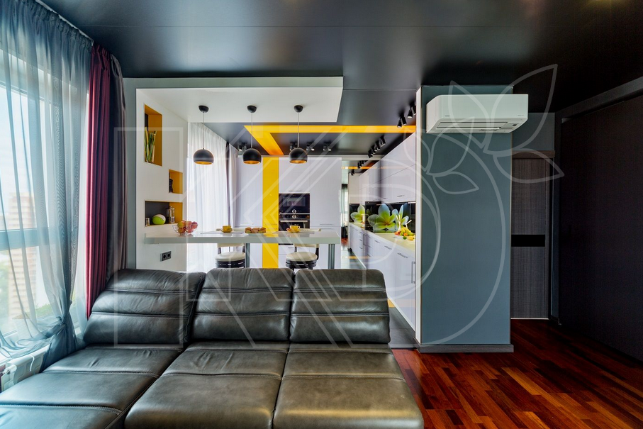 Как правило, гарнитуры с барной стойкой заказывают для довольно больших помещений: просторной, объединенной с гостиной кухни или квартиры-студии. В этом случае мебель размещают таким образом, чтобы стойка проходила по центру и условно делила пространство на две зоны: для отдыха и приготовления пищи.