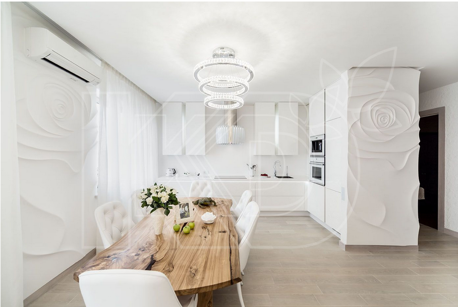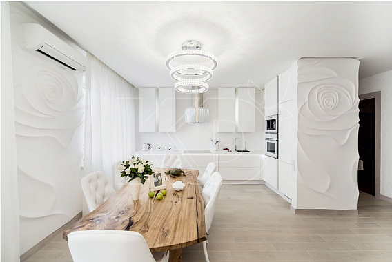 При использовании белого цвета в качестве основного помещение словно наполнено светом, легкостью и самыми мягкими тонами. Белые кухни позволяют визуально расширить пространство, комната будет казаться более просторной.