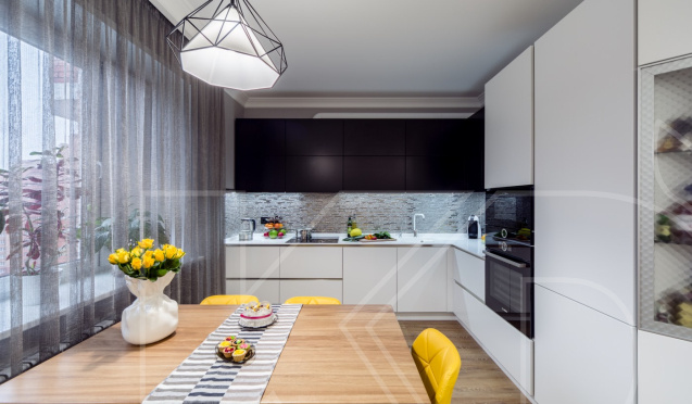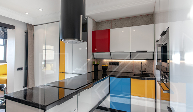 Если вы желаете создать современный интерьер и ищите более броские сочетания, обратите внимание на кухонные гарнитуры, в которых точечно использованы яркие детали. Красные, желтые или фиолетовые полки, черная столешница и кухонный фартук с золотыми разводами – все эти элементы внесут в пространство динамичные нотки, сделают его более живым.