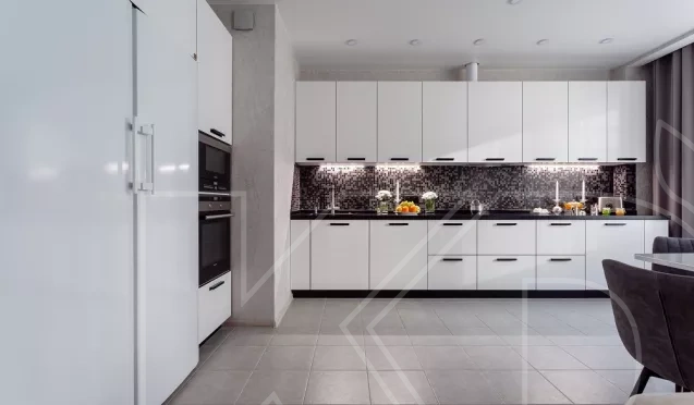 Если вы ищите максимально функциональный белый кухонный гарнитур, обратите внимание на стиль минимализм. Фасады подобных комплектов обычно гладкие и имеют утопленную фурнитуру. Организация шкафов у таких моделей продумана до мелочей, все системы хранения скрытые, бытовая техника встроенная. В минималистичных комплектах часто комбинируются горизонтальные и вертикальные модули.