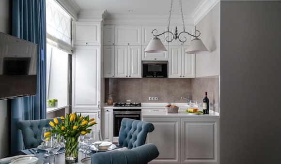 Для просторной квартиры с большими окнами и высокими потолками подойдет классическая белая кухня. Модель такого типа можно узнать по симметричным линиям, простым формам и роскошному декору. Фасады кухонной мебели в стиле классика оформляют лепниной, позолотой, резными узорами, патиной.