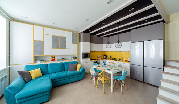 Островной набор мебели подойдет для квартиры-студии больших размеров. С его помощью можно отделить гостиную от обеденной зоны. При этом остров заменит обычный стол для приема пищи, что позволит сэкономить место.