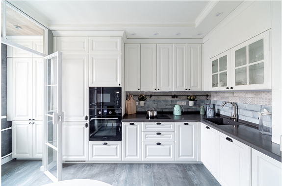 Во-вторых, белый цвет универсален и гармонично сочетается с любыми оттенками. А это означает, что у вас не будет никаких ограничений в выборе другой мебели и предметов интерьера: на белой кухне вы сможете с легкостью менять цвет стен, занавесок, кухонного фартука или обивки мягкой мебели.