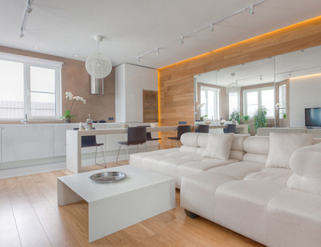 Неоклассика сочетает в себе классические мотивы и практичность модерна. Подобные кухни особенно хорошо смотрятся в больших помещениях. Конечно, можно подобрать неоклассический кухонный гарнитур и для более компактной комнаты. В этом случае следует использовать зеркальные и стеклянные вставки, открытые навесные полки вместо навесных шкафов.