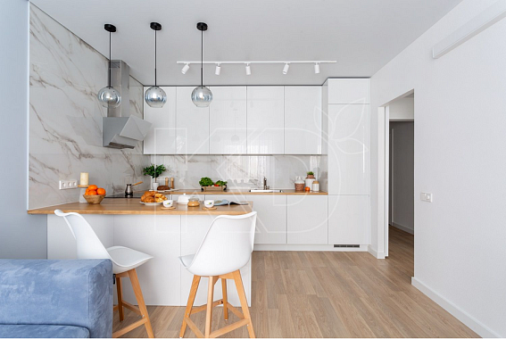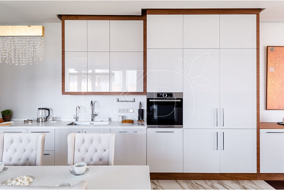 - Белые кухни делают помещение визуально более просторнорным, поскольку данный цвет обладает способностью зрительно расширять пространство. Особенно это актуально для небольших квартир. Эффект зрительного расширения пространства в белой кухне можно усилить при использовании глянцевых фасадов мебели. Хорошим выбором станут также современные белые гарнитуры, в которых сочетаются матовые и глянцевые поверхности. Например, нижние шкафы могут быть матовыми, а верхние ⎯ глянцевыми.
