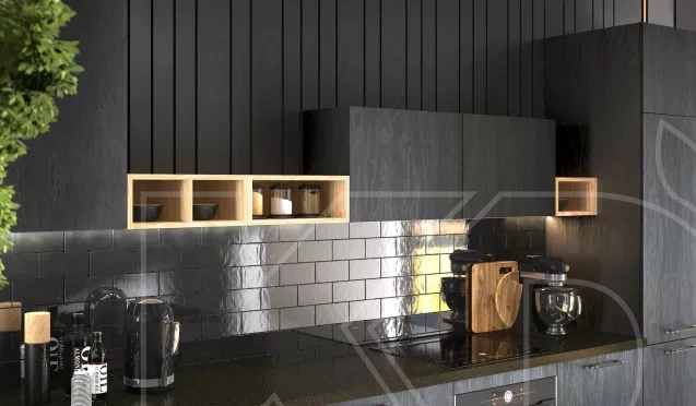 Прямой черный кухонный гарнитур отличается линейным дизайном с прямой столешницей и шкафами, расположенными вдоль одной стены. Прямая кухня идеально подходит для небольших помещений или квартир, поскольку максимально увеличивает доступное пространство, обеспечивая при этом достаточно много места для хранения и работы.