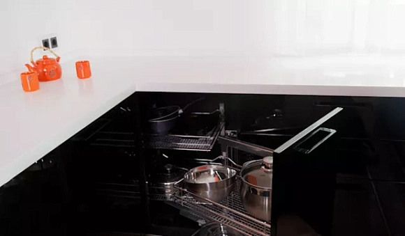 Угловой кухонный гарнитур черного цвета характеризуется современным дизайном с угловатыми шкафами и столешницами, которые создают смелый и яркий вид. Такую угловую кухню можно персонализировать с помощью различных текстур, отделки и материалов – матовые черные шкафы или блестящие черные столешницы помогут создать уникальное и индивидуальное пространство.