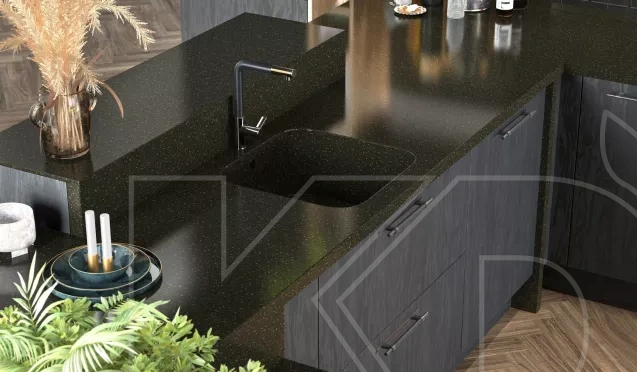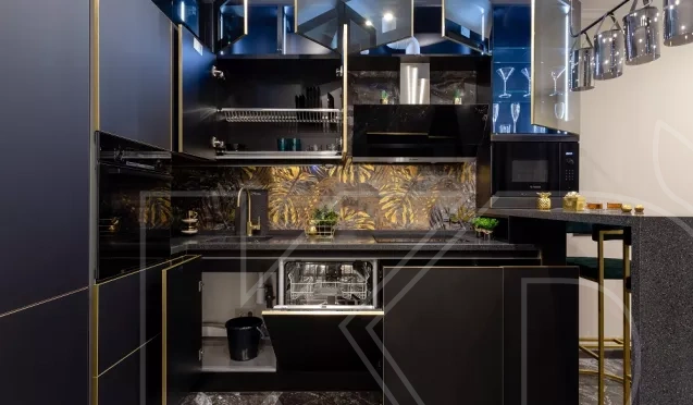 Стиль арт-деко — это смелые геометрические формы и роскошные материалы. Черный — популярный цвет в стиле арт-деко, поскольку он создает резкий контраст с блестящими металлами и отражающими поверхностями. Для воплощения стиля стоит рассмотреть возможность включения черных шкафов с золотыми или латунными акцентами, геометрической плитки для фартука и блестящих черных столешниц. Добавление зеркальных поверхностей или стеклянных подвесных светильников также может усилить ощущение арт-деко.
