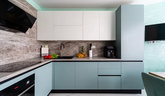новинки сезона, оформленные с однотонным покрытием мебельного фасада;