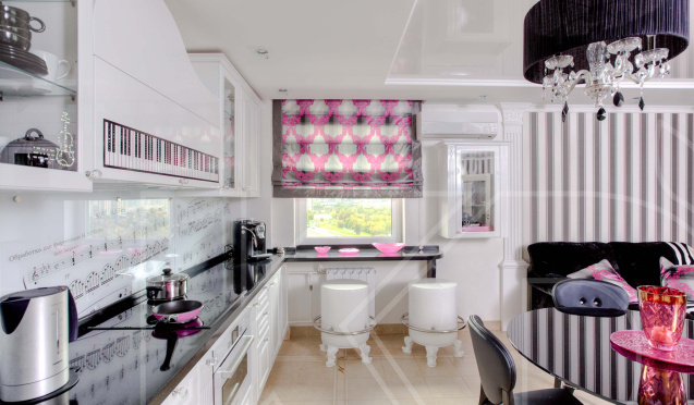 Кухни неоклассика. Данные модели сочетают в себе классические и ультрасовременные черты. Фасады подобных комплектов выполняют в чистых спокойных оттенках. Декоративную отделку применяют максимально лаконичную – в виде хромированных металлических элементов или стеклянных вставок.