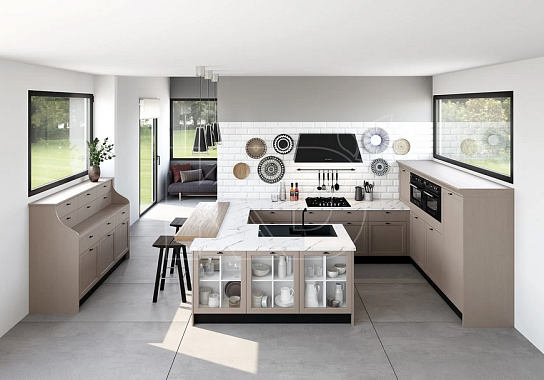П-образный способ размещения гарнитура больше подходит для просторных комнат. При этом все необходимая посуда и предметы бытовой техники находятся в непосредственной близости, что создает максимально комфортные условия для приготовления пищи. Нет необходимости совершать множество движений, чтобы использовать нужный предмет бытовой техники.