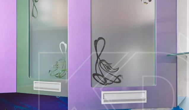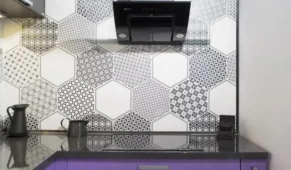 Кухни фиолетового цвета могут иметь ПВХ-панели, декоративную штукатурку, плитку или водостойкие моющиеся обои. В последнее время растет популярность фиолетовых жидких обоев с особыми вкраплениями и своеобразной текстурой. Для таких стен не нужен дополнительный декор. На обычных обоях могут быть извилистые линии и изящный цветочный рисунок молочного цвета.
