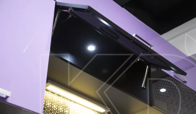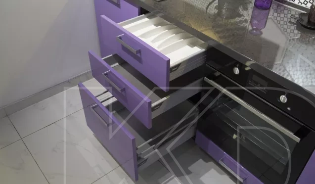 Рассматриваемые кухни фиолетовых цветов в каталоге кухонь на сайте изготавливаются на специализированном современном оборудовании с использованием передовых технологий. Благодаря этому гарнитур отличается наличием: