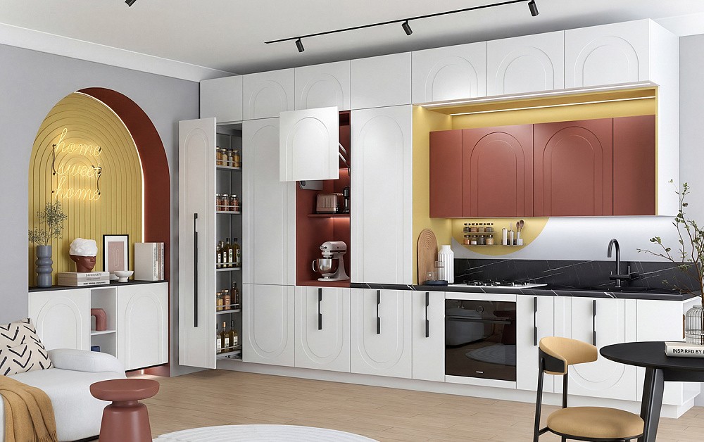 Точечные акценты — жёлтый, синий, кобальт, коралл — работают как вспышки энергии в интерьере: они оживляют пространство, добавляют настроения и мгновенно притягивают взгляд. Пара выразительных барных стульев, сочный текстиль или яркий фартук превращают спокойную базу в эффектный, запоминающийся образ — без визуального шума и перегруза. Это простой способ «включить характер» кухни и сделать её по-настоящему живой.