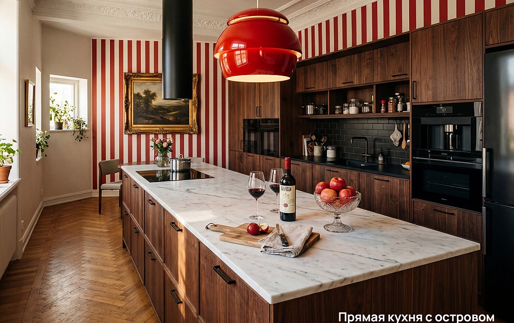 Смелое смешение эпох превращает кухню в настоящую галерею стиля, где каждая деталь рассказывает свою историю. Винтажные элементы, словно ноты из прошлого, добавляют характер и эмоциональный оттенок, превращая дизайн большой кухни гостиной в пространство, которое невозможно забыть. Такой интерьер живёт своей жизнью, удивляет гостей и отражает уникальность хозяев, создавая гармонию между прошлым и современностью.