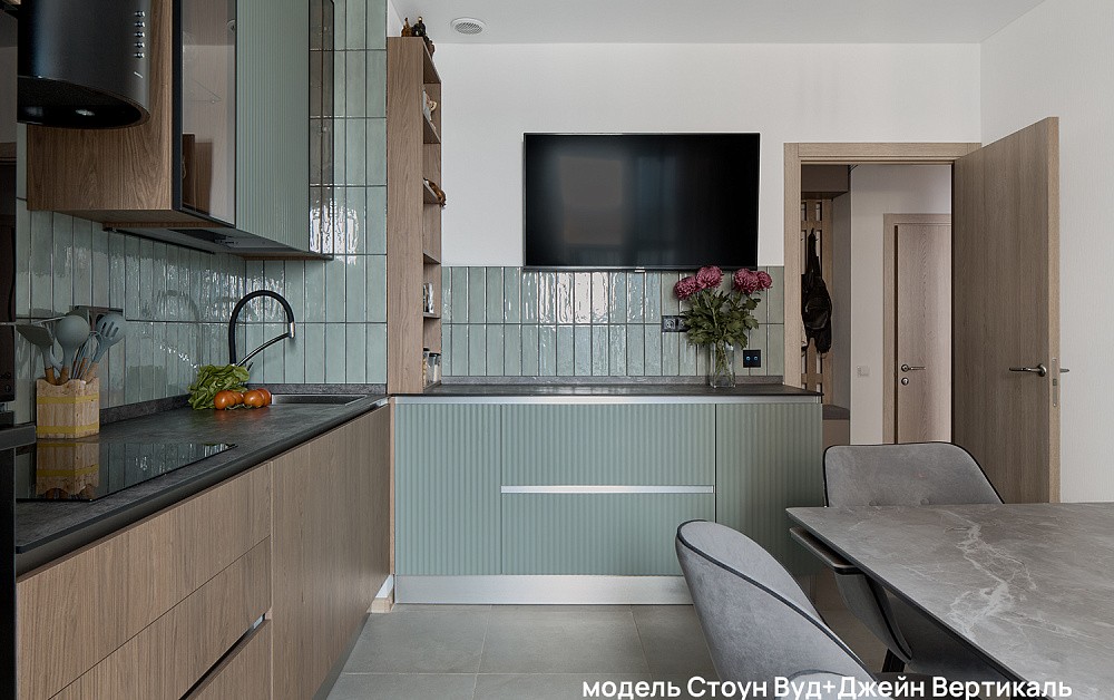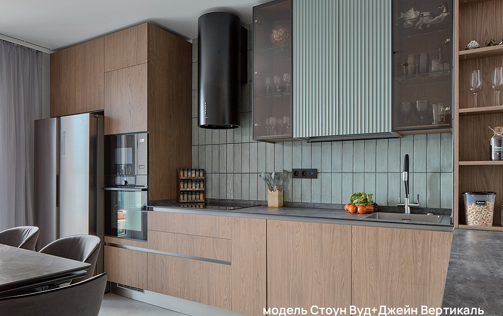 Рифлёные поверхности, бархатистое покрытие Мягкое прикосновение (Soft Touch) и тепло натурального дерева добавляют интерьеру глубины и тактильности. К таким материалам хочется прикасаться — они делают пространство живым, наполненным ощущениями и комфортом. Именно за счёт этих деталей кухня превращается из функциональной зоны в по-настоящему уютное место притяжения для всей семьи.