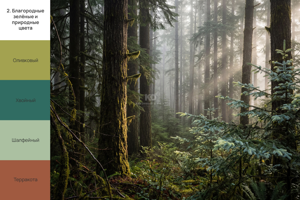 Оливковый, хвойный, шалфейный и терракота отражают запрос на экологичность. Такие расцветка и цвет хорошо смотрятся в проектах, где важна атмосфера спокойствия и природной гармонии. Это популярный тренд для семейных квартир и загородных домов.