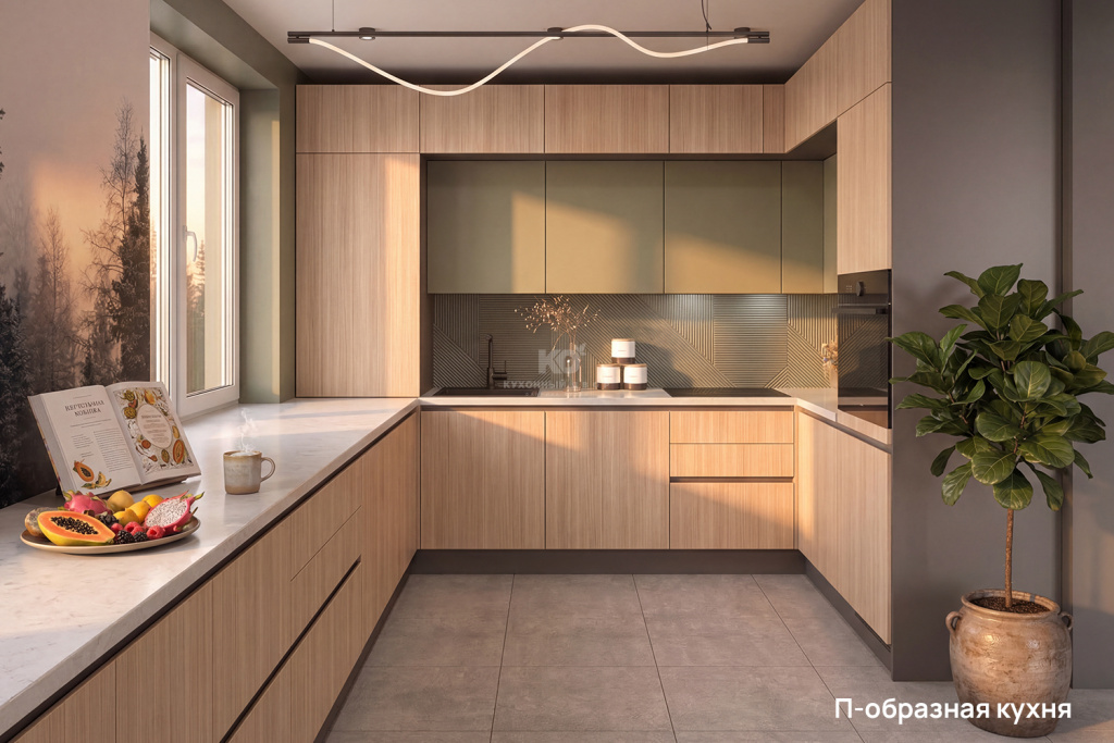 - П-образная компоновка идеально подходит для активной готовки: она обеспечивает максимум рабочей поверхности и вместительное хранение, превращая кухню в организованное пространство, где всё под рукой.