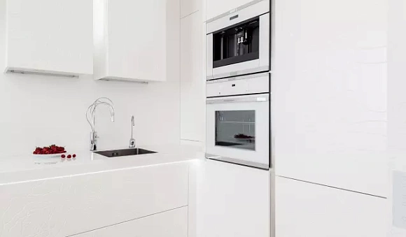 Блестящие поверхности раскрывают красоту и особенности стиля хай-тек. При этом в глянце выполняют как отдельные детали, так и полностью фасады. Модели в духе хай-тек выполняют как в самых светлых, так и темных тонах.