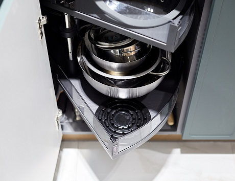 - шкафы с поворотными механизмами — помогут максимально использовать угловые пространства, которые обычно остаются не использованными.