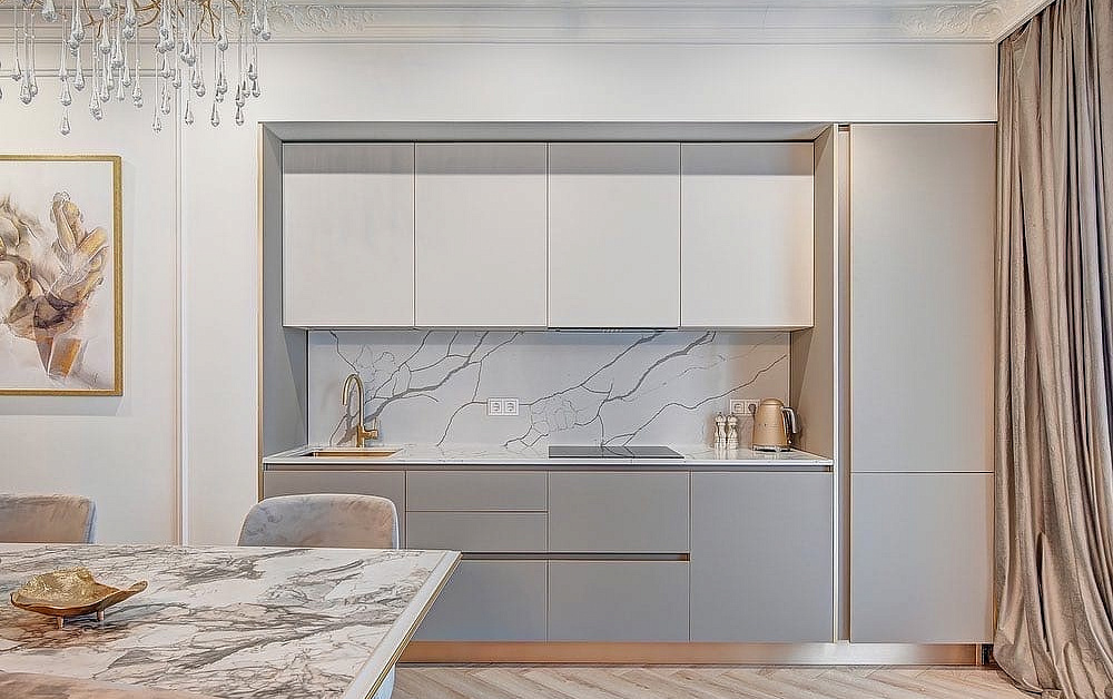 Столешница, заставленная разнообразной бытовой техникой, смотрится довольно неряшливо, особенно в небольших пространствах. Поэтому кухонная мебель со встроенной техникой выглядит гораздо привлекательнее. Спрятать за фасадами можно не только крупные предметы – вытяжку, духовой шкаф, посудомоечную машину, холодильник. Более мелкую технику, например, кофемашину, мультиварку и тостер тоже можно скрыть от глаз. Благодаря этому рабочая поверхность всегда будет выглядеть свободной и аккуратной.