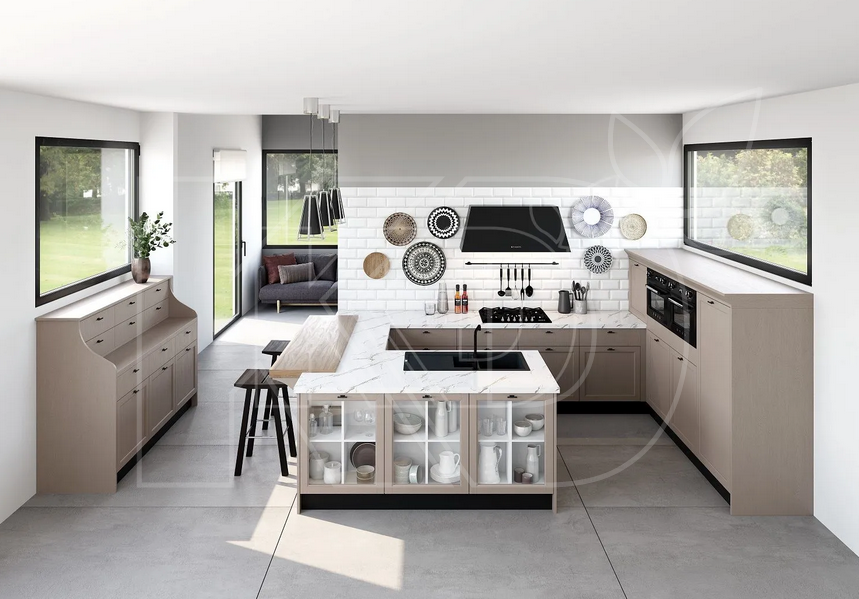 - Материал мебели. Сегодня на сайте можно заказать кухни как из массива дерева (бук, дуб, ясень), так из из МДФ, в том числе с фотопечатью. Столешница может быть выполнена из натурального или искусственного камня. Именно от этого выбора материала во многом будет зависеть итоговая стоимость работ.