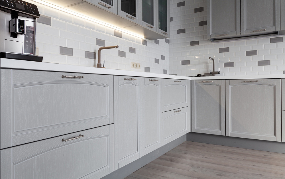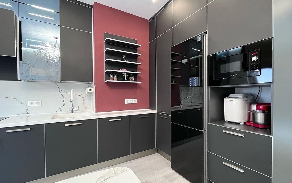 Если стены кухни не позволяют установить стандартный комплект мебели, рекомендуем заказать кухню по индивидуальным размерам. В этом случае дизайн-проект будет реализован с учетом особенностей помещения. Например, ниши будут использованы для установки полок и бытовой техники.