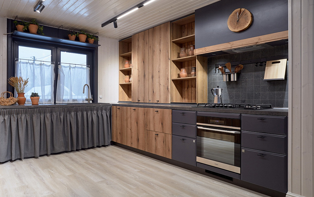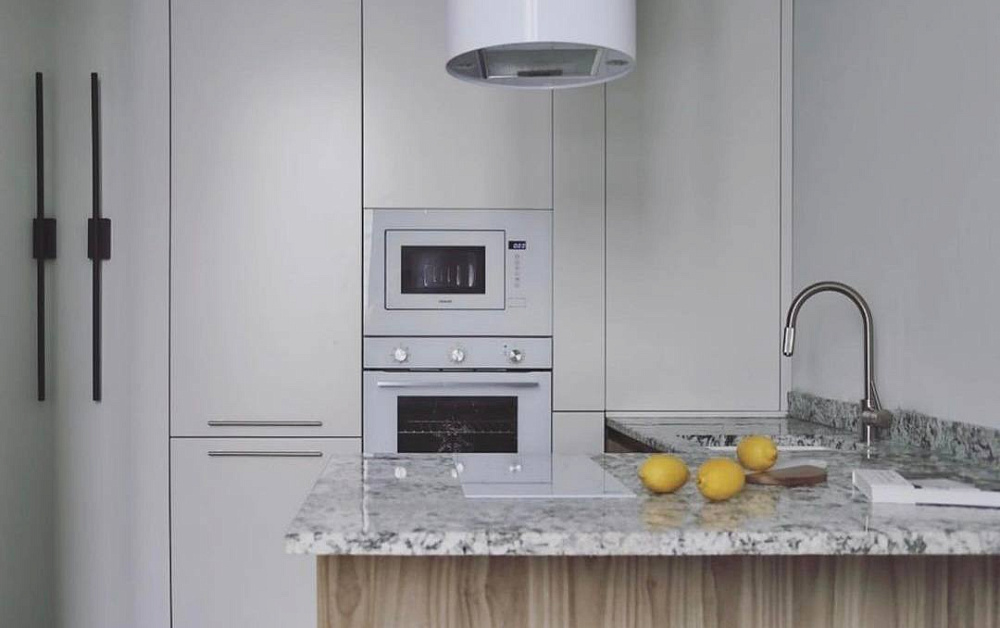 Данное правило в первую очередь касается параллельной и П-образной планировки. Для свободного перемещения между модулями потребуется расстояние 1,2-1,5 метра. В противном случае будет неудобно открывать дверцы шкафов и духовок.