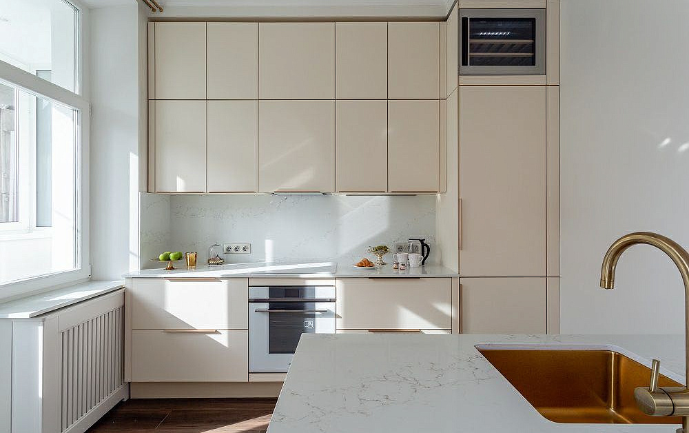Высокие шкафы-пеналы обычно устанавливают по краям. В них можно спрятать некоторую бытовую технику, а на самые верхние полки убрать предметы, которые используются очень редко.