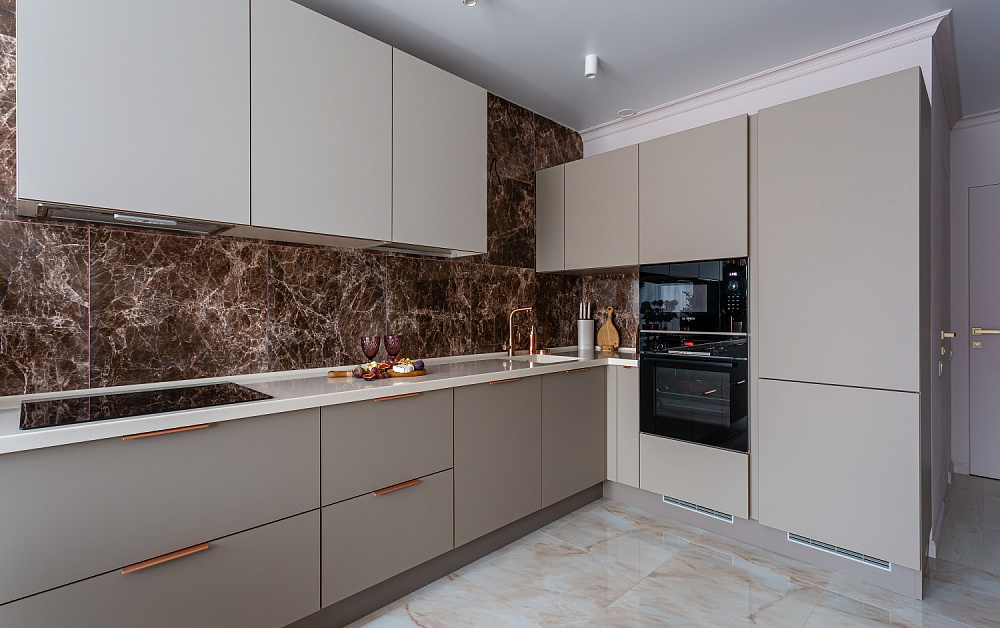 П-образный комплект – подходящее решение для просторных помещений. Шкафы такой кухни займут место сразу возле трех смежных стен.
