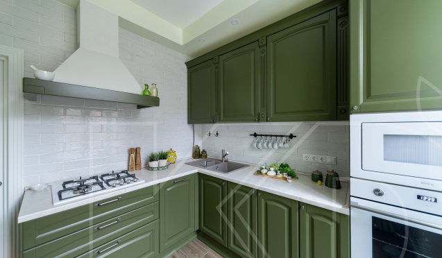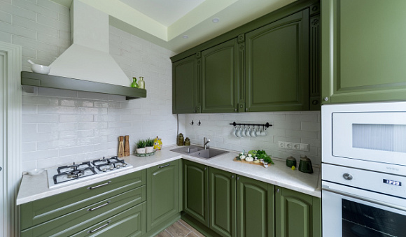 Очень свежо и оригинально выглядят кухни зеленого цвета. При этом поверхности малахитового и изумрудного оттенка будут уместны в больших пространствах. Салатовые и бледно-зеленые тона подойдут для небольшой площади. Чтобы сохранить в пространстве воздушность и свет, фасады такого гарнитура можно декорировать стеклянными и зеркальными вставками.