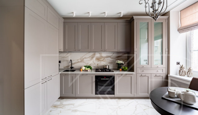 Светлые бежевые комплекты также подходят для небольших площадей. Как правило, их выполняют в минималистичных стилях – модерн, скандинавском, лофт и неоклассика. Поверхности комплектов могут быть как однотонными, так и комбинированными. Довольно часто их декорируют рамками, вставками из стекла и зеркала.
