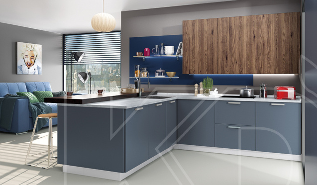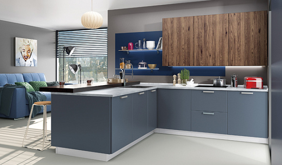Кухонная мебель в синих тонах выглядит эффектно и благородно. По мнению психологов, расцветка такого типа снижает аппетит, стимулирует умственную деятельность и креативность. Для самых компактных и средних площадей лучше выбрать лазурные, васильковые и бирюзовые тона. Сапфировые, кобальтовые и чернильные оттенки будут гармонично смотреться в просторных помещениях, расположенных на южной стороне.