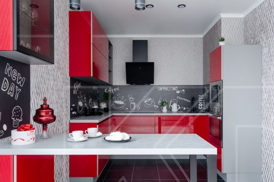 Очень интересный вариант – красная кухня. Такое решение подходит для пространства, оформленного в стиле арт-деко. Гарнитур алого цвета эффектно смотрится, вносит в интерьер динамику и энергию. Считается, что красный повышает аппетит и стимулирует пищеварение.