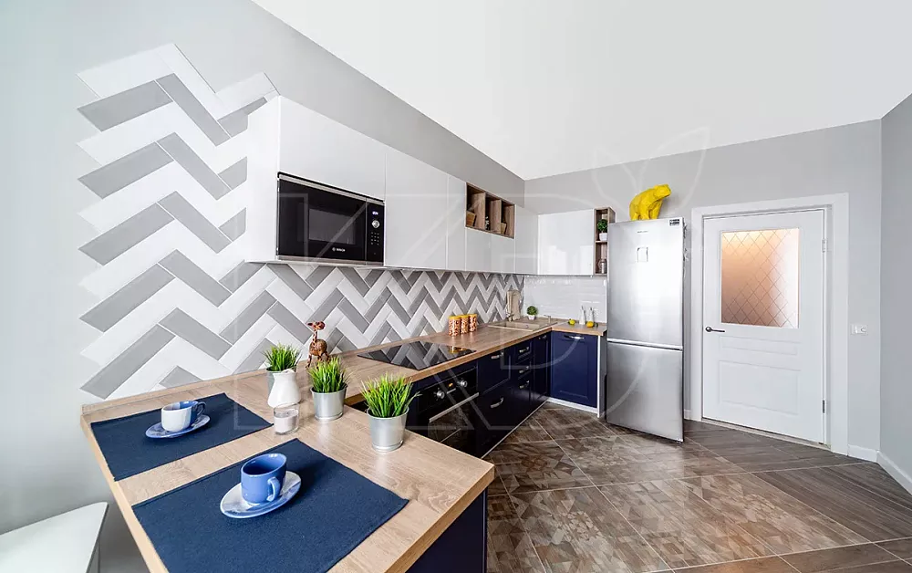 В больших комнатах можно использовать комбинированные кухонные гарнитуры. В таких моделях нижние фасады обычно выполняют в темном цвете, а верхние в белом. Благодаря такому подходу можно сделать пространство более интересным и гармоничным.
