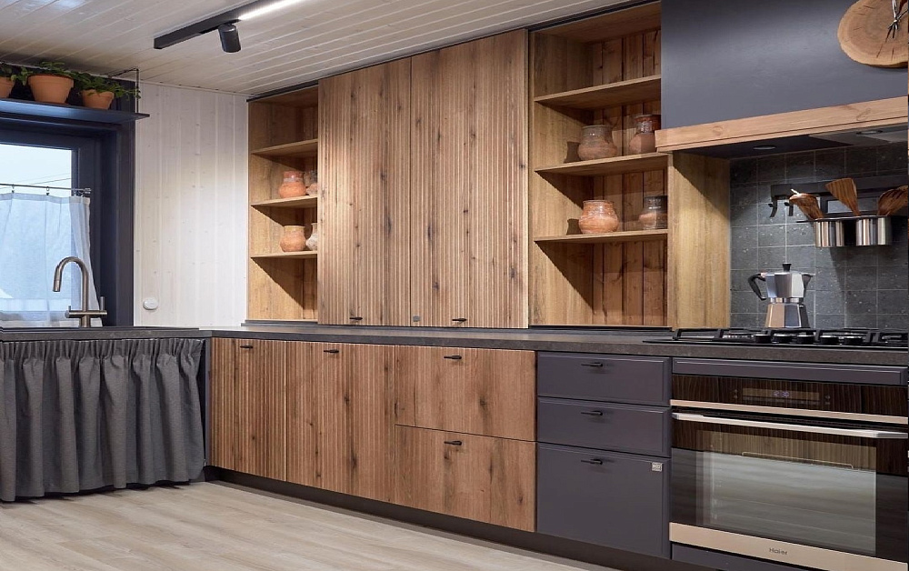 Также дуб применяют для создания комплектов в духе кантри. Природная палитра оттенков передает теплоту сельского стиля, его особое очарование и уют. Фасады таких моделей декорируют решетками и рамками, что создает завершенность и гармоничность дизайна.