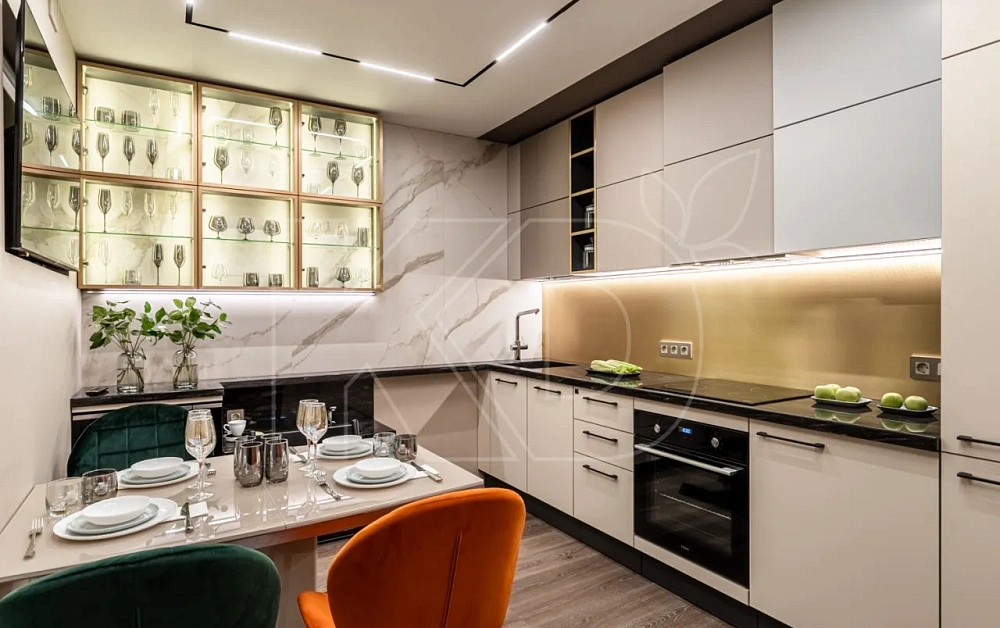 - Широкий ассортимент. Мебель для кухни такого цвета может иметь любую планировку.