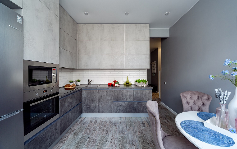 Благородно и дорого смотрятся не только бежевые и белые, но и другие светлые версии. Например, очень интересный вариант – розовый гарнитур с матовыми фасадами. С помощью такой мебели можно создать стильный интерьер даже на небольшой площади. Чтобы не перегрузить пространство розовой палитрой, ее можно разбавить белыми или светло-серыми оттенками.