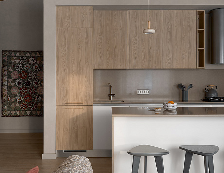 Геометрия кухни безупречна: прямые линии, вписанные в нишу, создают ощущение архитектурного абсолюта. Но истинное «сердце» пространства — монументальный остров. Его столешница в оттенке капучино напоминает гладкий речной камень, отшлифованный временем. Это многоликое пространство: утром — алтарь для кофе и тихих раздумий, днем — профессиональный цех кулинарного искусства, а вечером — место силы, где за бокалом аперитива рождаются самые важные семейные истории.