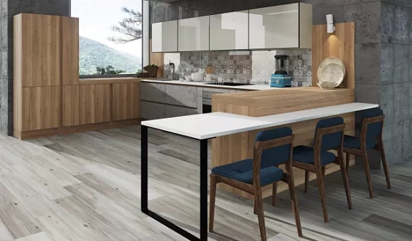 Кухонный фартук можно оформить закаленным стеклом, разноцветной мозаикой или керамической плиткой. Также хорошо будет смотреться деревянная скиналь, обработанная специальным составом от жировых пятен.